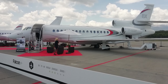 Die Falcon 8X ist das Paradepferd von Dassault, sie wurde an der EBACE 2014 in Genf lanciert und startete am 6. Februar 2015 in die Flugerprobung, der dreistrahlige Business Jet ist seit Juni 2016 zugelassen. Die Falcon 8X ist eine verbesserte und leicht gestreckte Falcon 7X. Die Kabine der Falcon 8X ist mit einer Länge von 13 Metern gut 1,1 Meter länger als die der Vorgängerin Falcon 7X. Dank sparsameren Triebwerken und mehr internem Treibstoff konnte die Reichweite verglichen mit der 7X bei der 8X von 5.950 Nautischen Meilen (11.019 km) auf 6.450 Nautische Meilen (11.945 km) erhöht werden. Diese Reichweite kann bei einer Reisegeschwindigkeit von Mach 0,80, einer dreiköpfigen Besatzung und mit acht Passagieren überwunden werden. Mit diesen Leistungswerten kann die Falcon 8X Städtepaare wie New York und Dubai nonstop verbinden. Die Falcon 8X kostet rund 57 Millionen US Dollar.