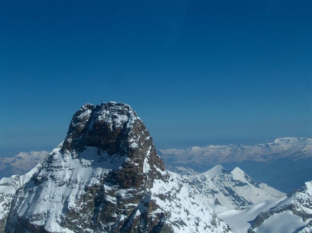 In nördlicher Richtung folgen wir dem Mattertal. Zermatt bleibt unter uns zurück, links ragt die mächtige Schneewand des Weisshorns(4506), vorbei geht es an den Geröllmassen des Felssturzes von Randa. In der Ferne leuchten nun schon die Industrieanlagen von Visp im Sonnenlicht.
