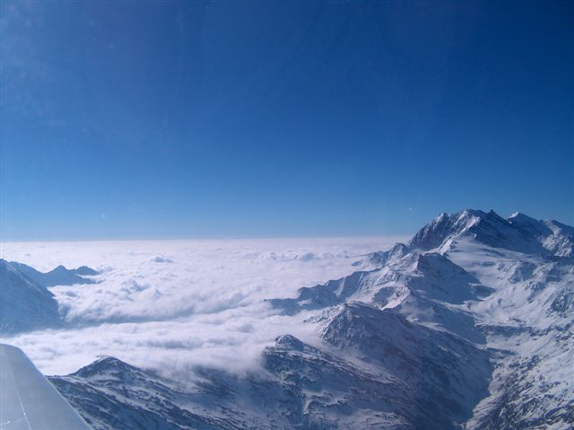 Die Luft ist ruhig, die befürchteten Turbulenzen und Abwinde bleiben aus. Unter uns ist reger Betrieb auf den Skipisten am Breithorn und Gornergrat. Direkt vor uns das imposante Matterhorn, herrschaftlich und furchteinflössend. Ein kurzer Ruf auf 124.925, und der freundliche Controller von Milano-Information erlaubt uns die Umrundung des Matterhorngipfels. Auf der Südseite des Berges ist ja schon italienisches Hoheitsgebiet. Der Aufenthalt in Höhen über 10.000 Fuss ohne Sauerstoffzufuhr sollte 30 Minuten nicht überschreiten. Deshalb leiten wir jetzt den Sinkflug ein. Gemischhebel auf rich, Drehzahl auf 2000, also immer mit etwas Gas, um shockcooling des Motors zu vermeiden.