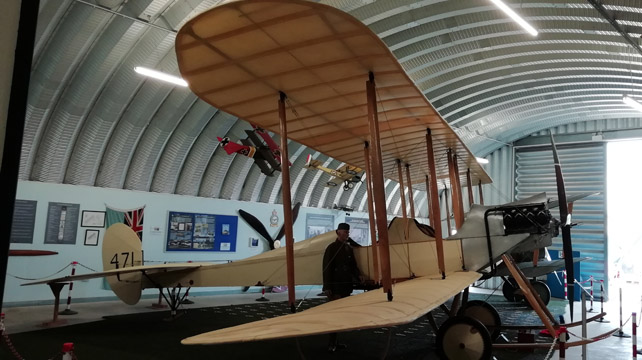 Die Royal Aircraft Factory B.E.2a wurde durch Leutnant Hubert Dunsterville Harvey-Kelly geflogen und gehörte während dem Ersten Weltkrieg zur No.2 Squadron des Royal Flying Corps. Leutnant Harvey-Kelly war der erste britische Flieger des Royal Flying Corps, der in Frankreich landetet. Er war auch der erste britische Pilot, der ein deutsches Flugzeug vom Himmel holte. Harvey-Kelly hatte im Ersten Weltkrieg jedoch nicht viel Fliegerglück, er kam im Blutigen April 1917 ums Leben. Bei dem Royal Aircraft Factory B.E.2a Ausstellungsmuster handelt es sich um einen Nachbau des legendären Doppeldeckers.