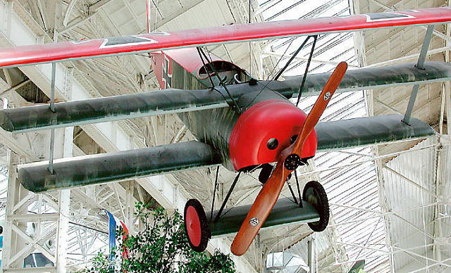 In der Halle gibt es für den Luftfahrtinteressierten viel zu sehen, von Lilienthals Hängegleiter zum legendären Flyer der Gebrüder Wright, beides sehr gute Nachbauten zu Fokker Dreidecker, der in doppelter Ausführung vorhanden ist. Das Flugzeug von Paul Bäumeler hängt etwas unglücklich mit dem Kopf nach unten an der Wand, es hat sogar einen Orginal Oberursel Umlaufmotor. Natürlich ist der „Rote Baron“ auch da, er schwebt gelassen über dem Trubel, hier ist zu erkennen, dass es sich um einen Nachbau handelt.